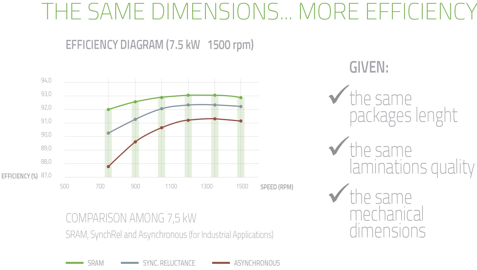 Efficiency: Although asynchronous and synchronous motors have the same size and cost, SRAM achieves higher efficiency, especially in part of the load range. Compared with permanent magnet motor, although permanent magnet motor achieves the maximum peak efficiency, SRAM achieves higher efficiency in the whole working range.